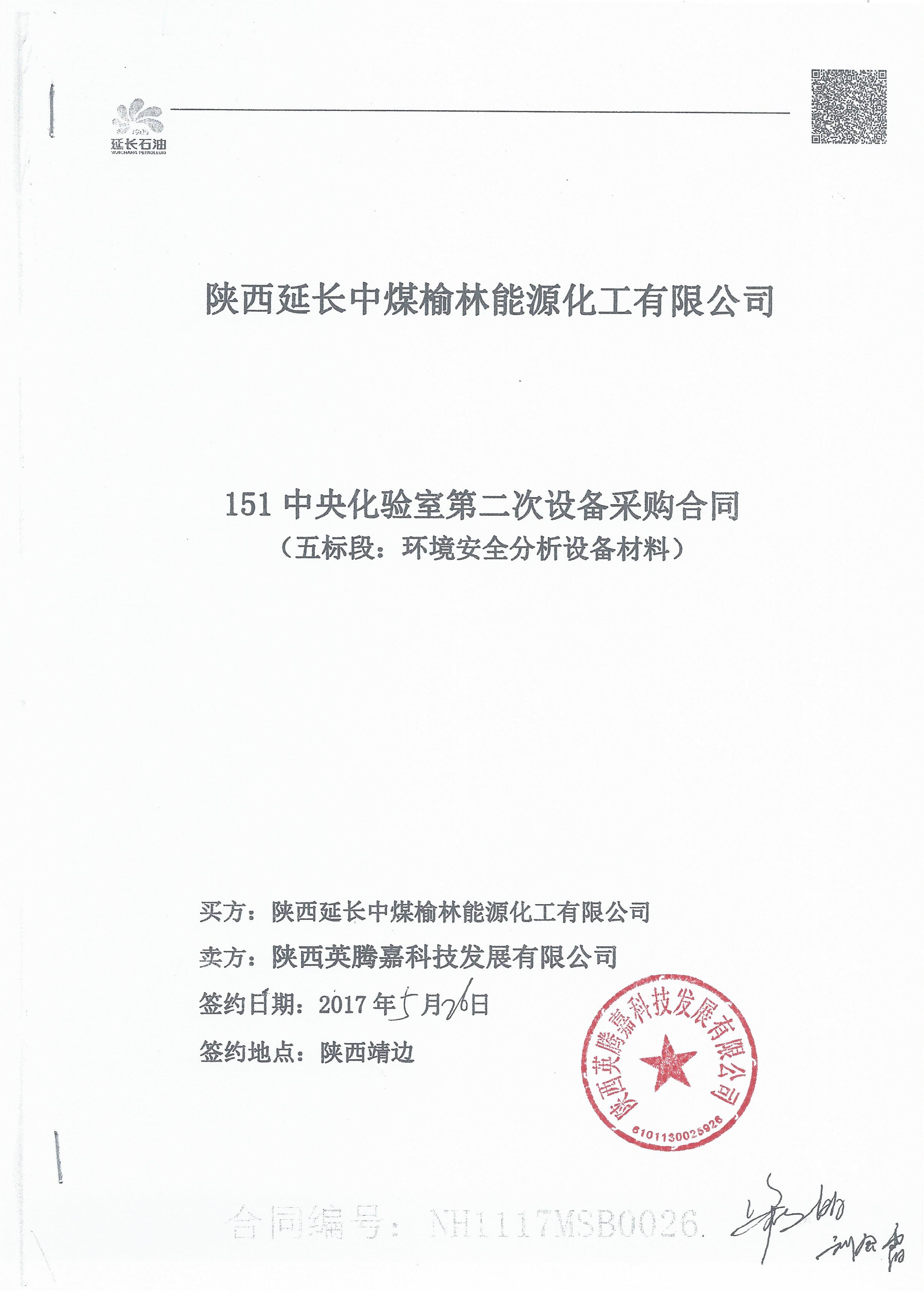 2017年2月14日,我司参加了由陕西省招标有限责任公司组织的陕西延长中煤榆林能源化工有限公司151中央化验室第二次设备采购项目第五包:环境安全分析设备材料的投标,最后我司以综合分排名第一中标。此次项目涉及10类仪器,有大型GCMS-VOC联用仪、红外烟气分析仪、恒温恒湿培养箱、烟尘(烟气)分析仪、比表面积测定仪等,中标后签订合同及部分产品如下: